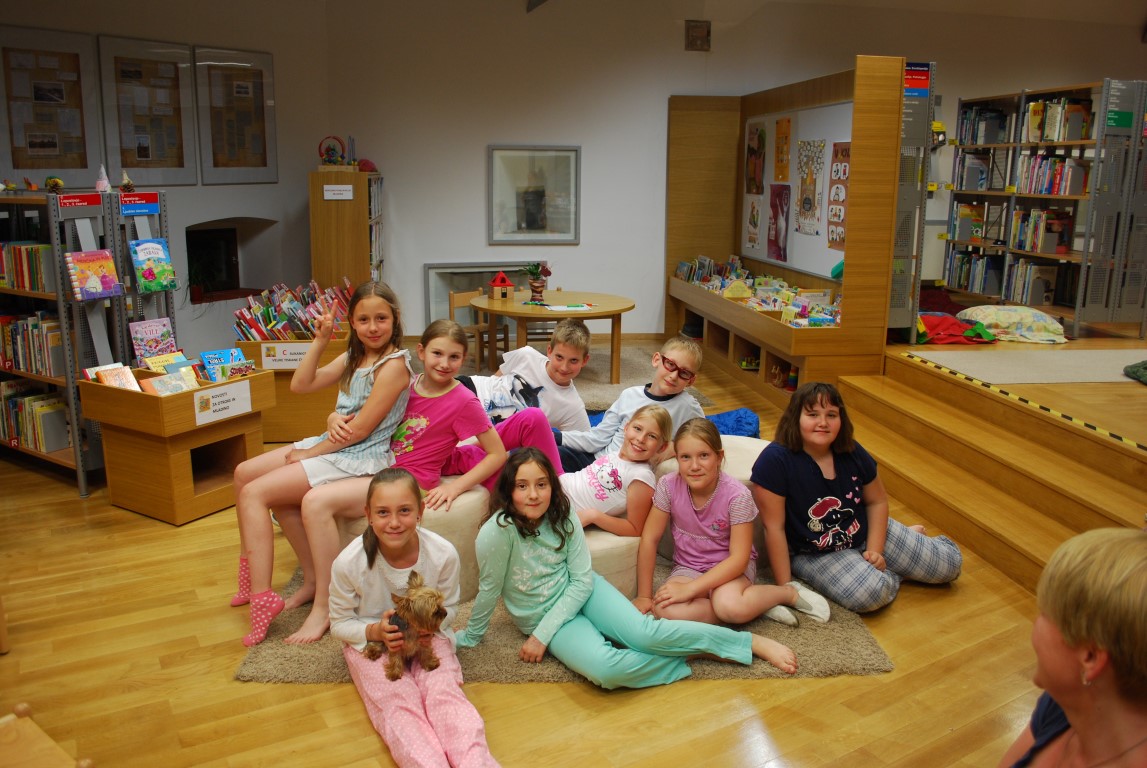 Ko so obiskovalci zapustili grad, se je začela zabava za knjigoljube. Po večerji, z motom »Mizica, pogrni se« je sledil pižama party z mojo plesno delavnico, z iskanjem skritega zaklada in improvizacijo pravljičnih prizorov. Kako bi na primer vi odigrali vsebino, katere glavne osebe so motor, trije bratje, sedem kozličkov in zajec, vloge pa si razdelili štirje gledalci? Če pridete k nam na OŠ Polzela, vam izdamo našo različico.