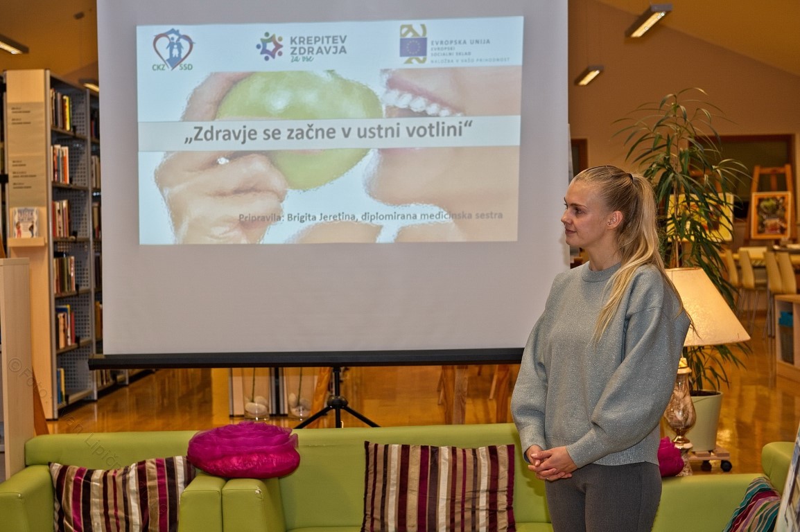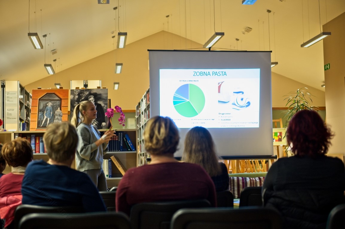 V torek, 12. novembra 2019, je v Občinski knjižnici Prebold potekalo strokovno predavanje o ustnem zdravju. Izvedla ga je diplomirana medicinska sestra Brigita Jeretina, ki skupaj z zdravstvenim timom sodeluje na področju preventivnega zdravstvenega varstva v Centru za krepitev zdravja Spodnje Savinjske doline. Ta predstavlja samostojno organizacijsko enoto v Zdravstvenem domu Žalec, v katerem sodeluje tim strokovnjakov različnih strok in profilov pri izvajanju delavnic, strokovnih srečanj in predavanj ter drugih dogodkov, z namenom ohranjanja in krepitve zdravja za vse prebivalce Spodnje Savinjske doline. Center za krepitev zdravja se je z začetkom leta 2018 vključil v evropski projekt z naslovom »Nadgradnja in razvoj preventivnih programov ter njihovo izvajanje v primarnem zdravstvenem varstvu in lokalnih skupnostih«. Predavateljica je spregovorila o preventivni zdravstveni dejavnosti, ki si vse bolj prizadeva za večjo ozaveščenost odrasle populacije tudi na področju zdravja zob in dlesni. Ustno zdravje namreč pomembno prispeva k višji kakovosti življenja in hkrati predstavlja neločljivi del splošnega zdravja. Bolezni ustne votline močno vplivajo na vse osnovne funkcije ustno-obraznega predela. Karies predstavlja eno izmed najbolj razširjenih kroničnih infekcijskih bolezni ustne votline, ki nastane zaradi kopičenja zobnih oblog na zobnih površinah. Poleg kariesa tudi parodontalna bolezen predstavlja pogosto bolezen ustne votline, ki se vedno začne z vnetjem dlesni, sčasoma pa napreduje v kronično okvaro obzobnih tkiv. Zdravje obzobnih tkiv predstavlja področje, kjer je povezava ustnega in splošnega zdravja najbolj raziskana. Obstaja namreč pomembna povezava med različnimi kroničnimi boleznimi in ustnim zdravjem. Parodontalna bolezen močno povečuje tveganje za pojav bolezni srca in žilja, zapletov med nosečnostjo in nekaterih presnovnih motenj. Mehansko odstranjevanje zobnih oblog z redno uporabo primerne zobne ščetke v kombinaciji z zobno nitko in drugih pripomočkov za čiščenje medzobnih prostorov je eden izmed najučinkovitejših načinov za doseganje ustnega zdravja, pri čemer pomemben temelj predstavlja tudi zdrava prehrana z opuščanjem nezdravih življenjskih navad. Dogodek je potekal tudi v sodelovanju z Martino Lesjak Povše in Jelko Pečar, obe iz Patronaže Prebold.