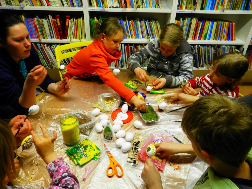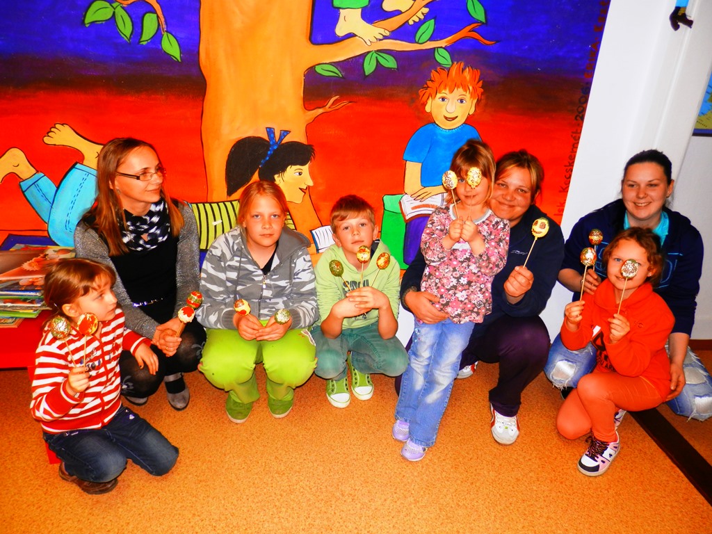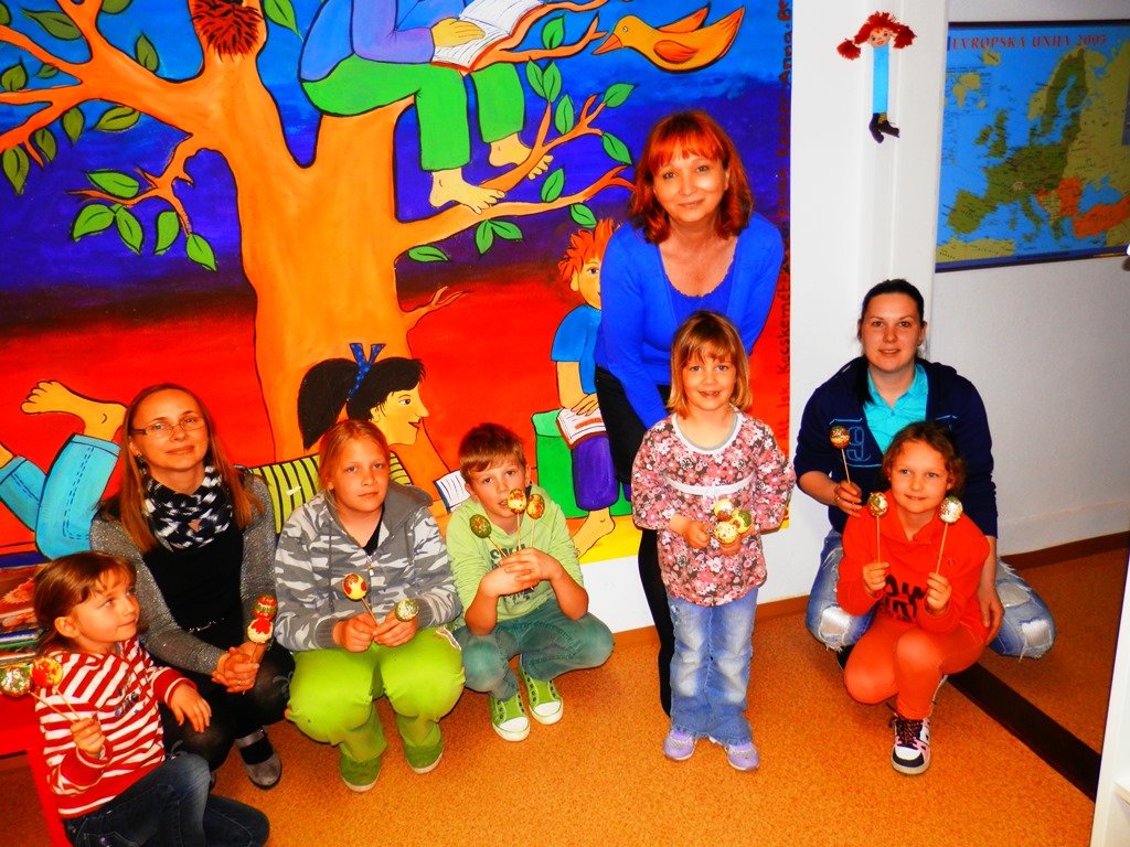 Jabolčno jajčno pravljično druženje smo imeli nocoj v griški knjižnici. Pravljica o jabolčnem kralju otroke uči, da je treba deliti, posebej tisto, kar da narava. Kar je od narave, lahko občuduje vsak. S tem, kar je dala narava, le malo posušeno in predelano, smo krasili jajca. Ja, tak čas se bliža. Ustvarjalnost je otroke umirila, povedali so marsikaj, kar plavalo je iz njih …