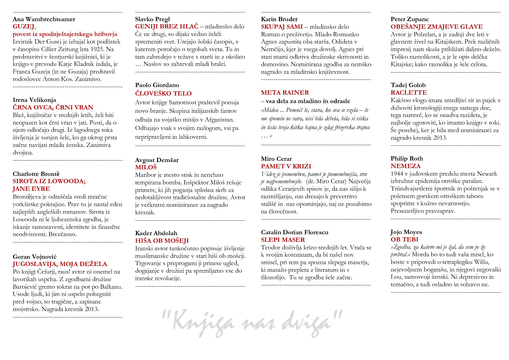 Ob vpisu boste prejeli zgibanko z zapisi vseh izbranih vsebin letošnjega branja. Vsebine boste našli tudi na naših domačih straneh pod zavihkom Projekti. Želimo, da izbrane vsebine postanejo vaše čtivo v daljšem časovnem obdobju, do konca bralne sezone pa morate prebrati najmanj pet del. Meseca aprila vas bomo spomnili, da se branje bliža zaključnemu srečanju. Na list boste zapisali vaše misli o knjigah. Zapise boste oddali v eni od enot knjižnice.