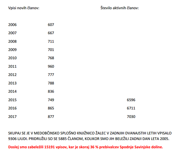 obveščamo vas, da smo na podlagi 21. člena Zakona o varstvu osebnih podatkov in 15. člena Zakona o knjižničarstvu dolžni iz evidence izbrisati vse neaktivne člane knjižnice, to so tisti, ki nas niso obiskali najmanj eno leto in so poravnali vse obveznosti do knjižnice. Izbrisan član se bo ob obisku moral ponovno vpisati v knjižnico.