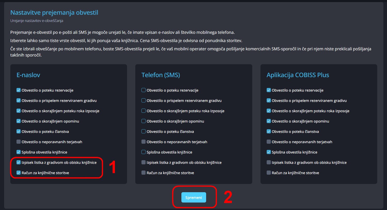 Vklop lahko opravite sami prek svojega profila COBISS Plus v nastavitvah obveščanja.