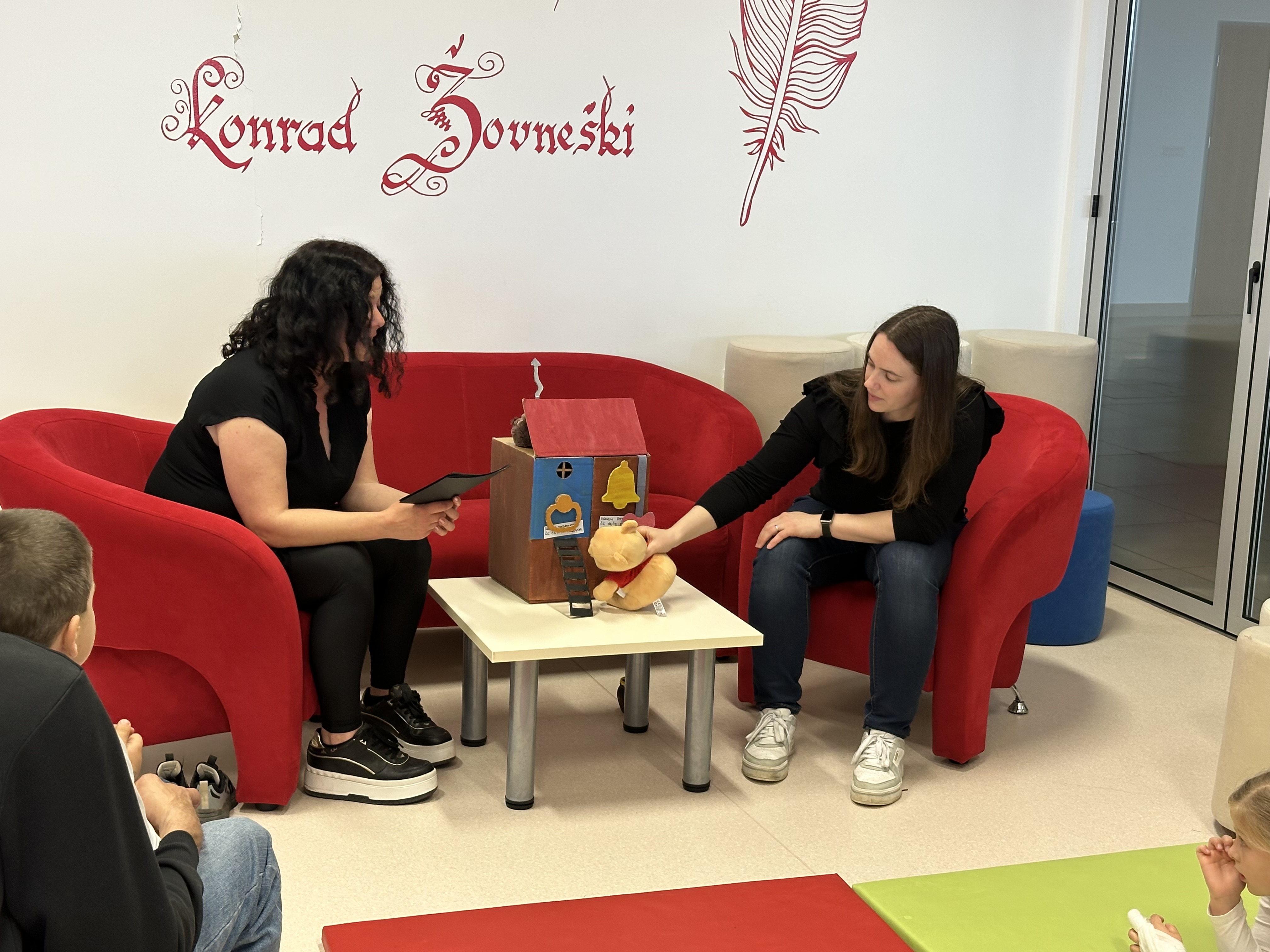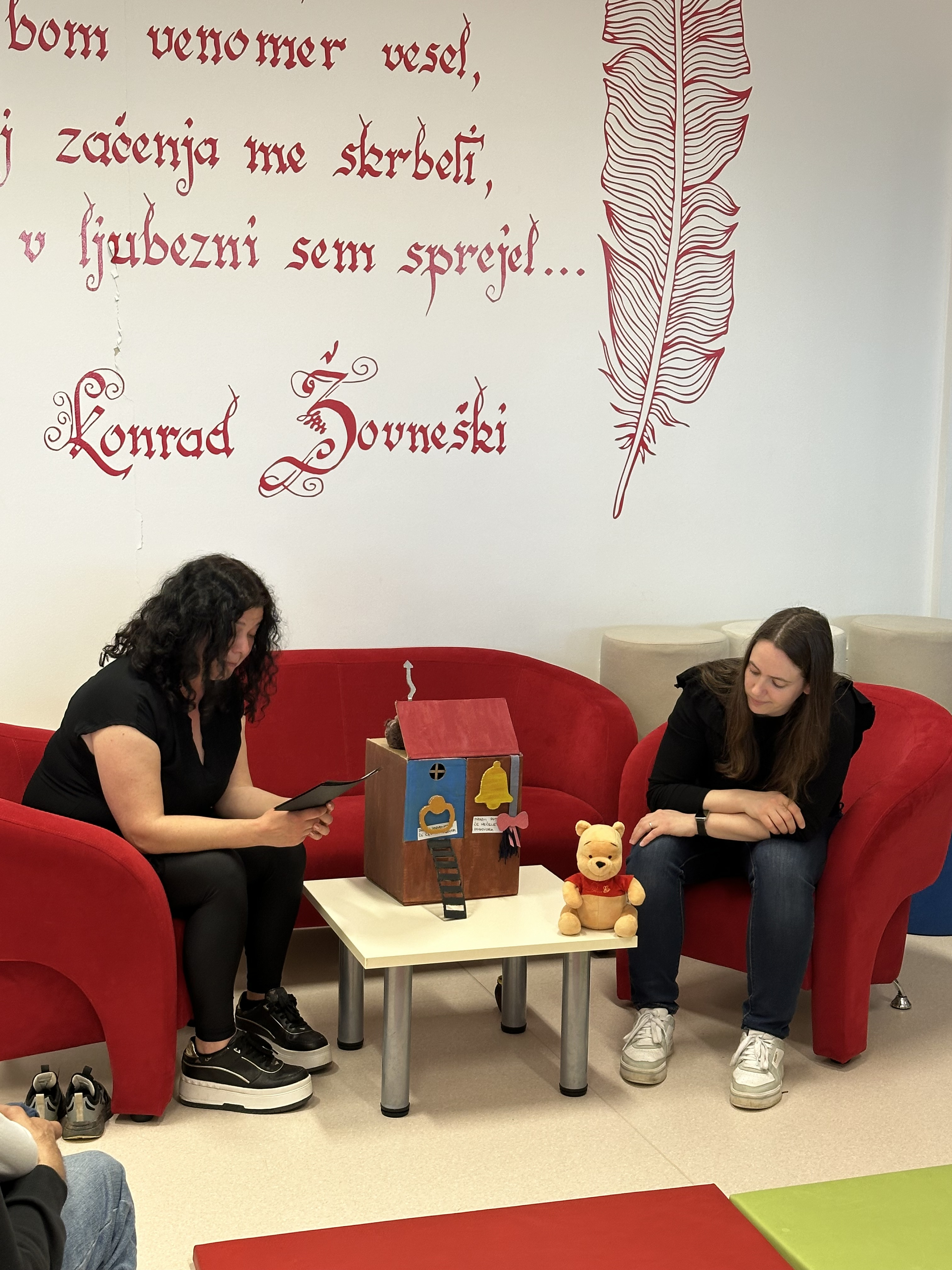 Z otroki smo najprej ugotavljali, kako dobro poznajo medvedka Puja in njegove prijatelje iz Stoletne hoste. Prišli smo tudi do njegovega otožnega prijatelja oslička, ki velikokrat izgubi svoj rep. In prav zgodbico o tem sva jim s pomočjo plišastih igrač tudi zaigrali. Medvedek Pu je dober prijatelj in osličku je hitro obljubil, da mu bo rep pomagal najti. Seveda je obljubo tudi držal. In v Stoletni hosti je bilo spet vse tako, kot mora biti.