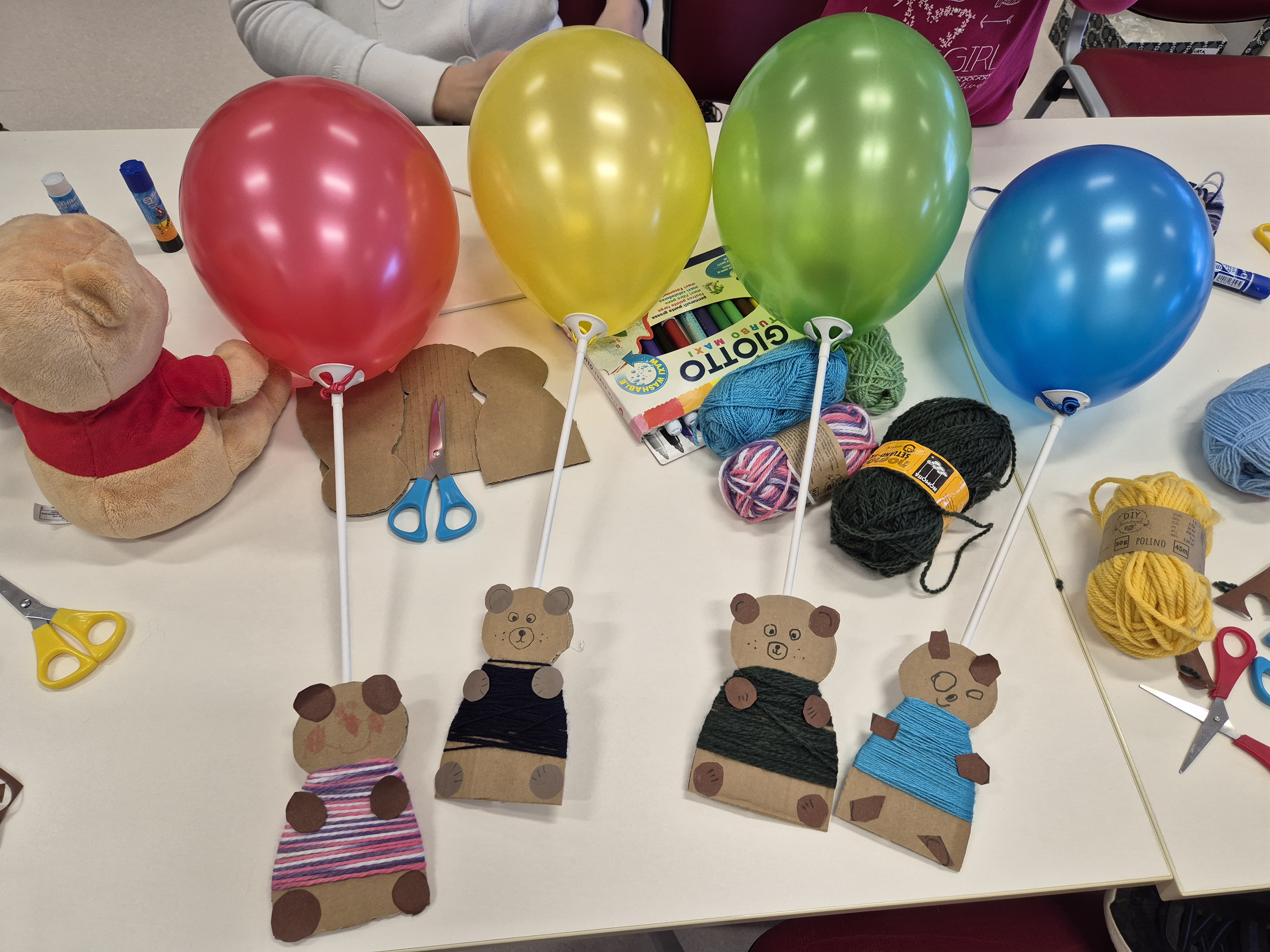 Medvedek Pu pa ni samo prijazen in srčen, ampak je tudi iznajdljiv. V eni izmed zgodbic si je kar z balonom pomagal priti do medu, saj je čebelji panj, ki je skrival njegovo najljubšo jed, visel visoko na drevesu. Tako smo v ustvarjalnem delu našega pravljičnega druženja izdelali medvedka in ga pripeli na balon. Otroci so bili navdušeni in izdelali več medvedkov.