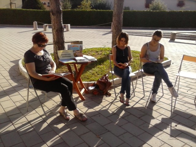 Pred občinsko knjižnico je bilo še posebno zanimivo branje pod krošnjami dreves, izvedli smo ga dvakrat. Obiskovalci so prisluhnili dnevnim zanimivostim iz časopisov in revij, skupaj smo doživljali bogastvo slovenske proze in poezije ter ob poletnem kramljanju izrazili svoje vtise.
