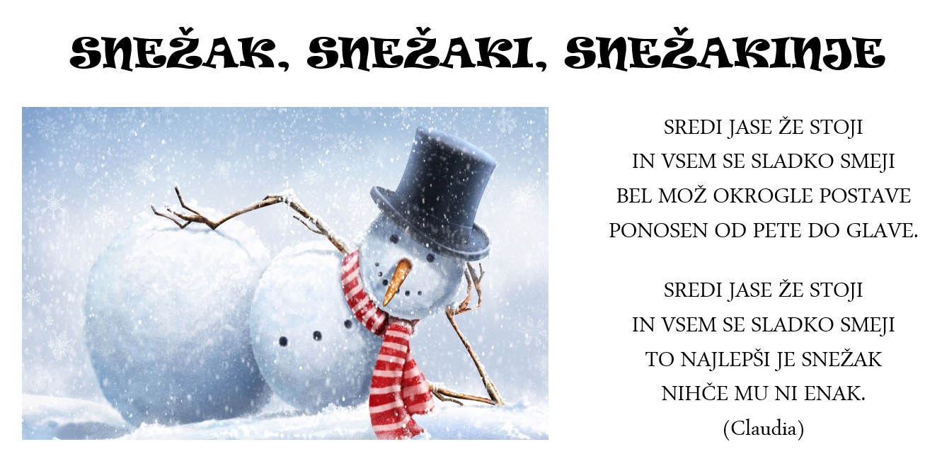 Snežaki … Veliki in majhni. Suhi in debeli. Z velikimi trebuhi, raztrganimi klobuki. S korenčkom namesto nosu in kot oglje črnimi očmi. Vsi so lepi. Najlepši in najboljši. Nekaj smo jih naredili tudi mi. A ker brez pravljice ne gre, smo tokrat prebirali zimske dogodivščine veveričje družine. Pepi, Piko in Pika so tri razigrane veveričke, željne sankanja v ledeno mrzlem jutru. Očka se greje pred kaminom in mama ima toliko dela. A sani so težke. In veveričke potrebujejo pomoč …