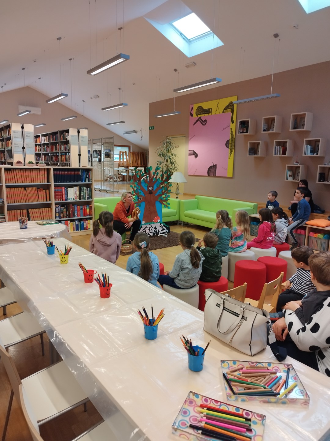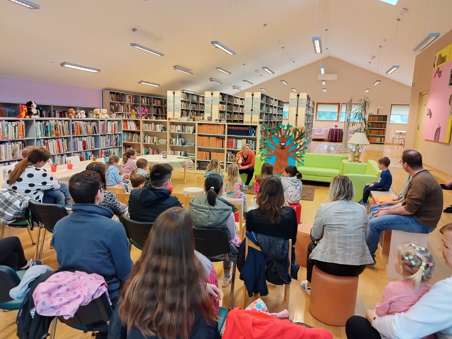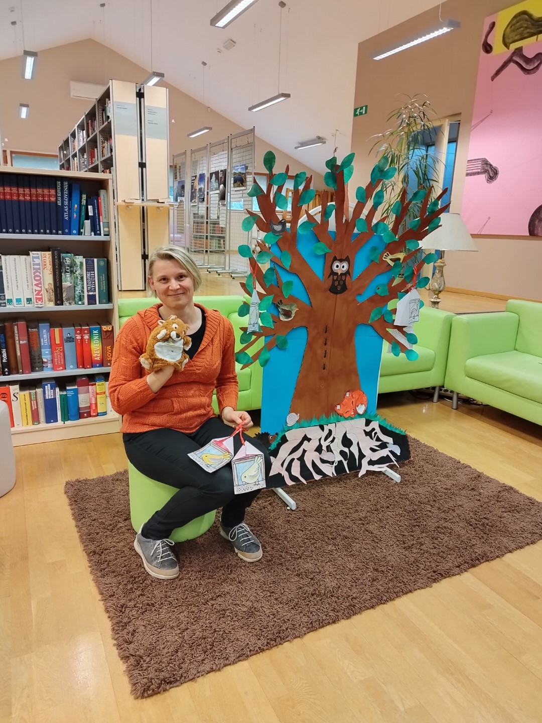 V četrtek, 20. aprila 2023, je v Občinski knjižnici Prebold potekala pravljična ura s poustvarjanjem. Tokrat so naši najmlajši obiskovalci ob navdihujočem drevesu prisluhnili Ani Grašinar, ki je s seboj pripeljala pripovedovalko veveričko.
