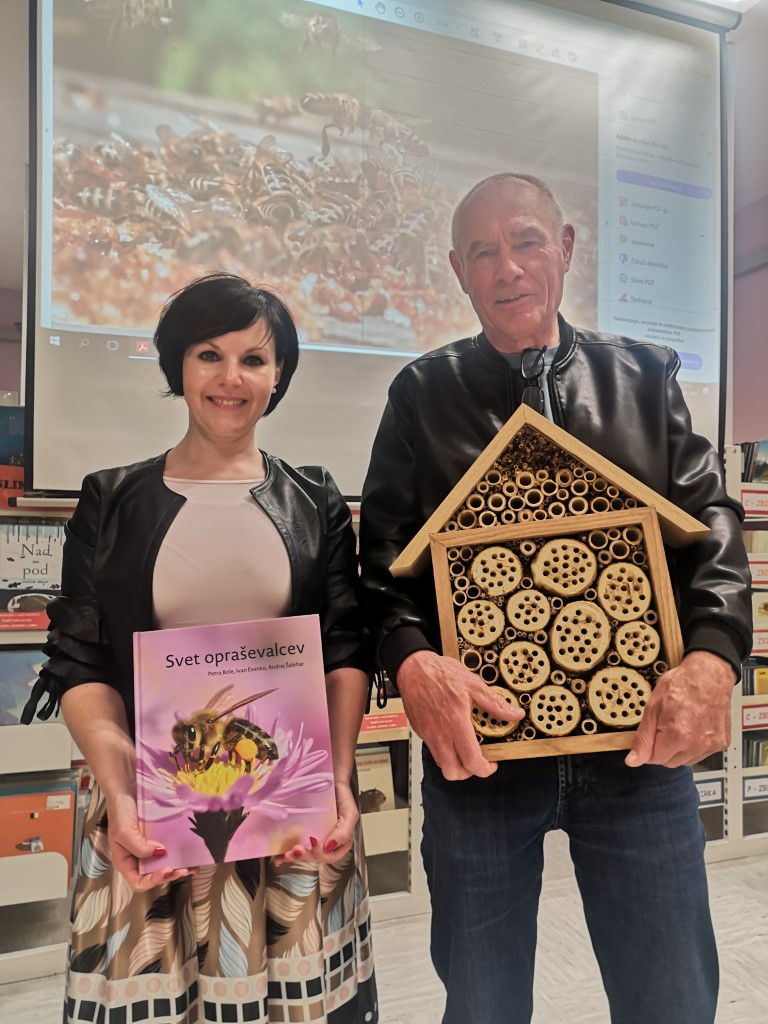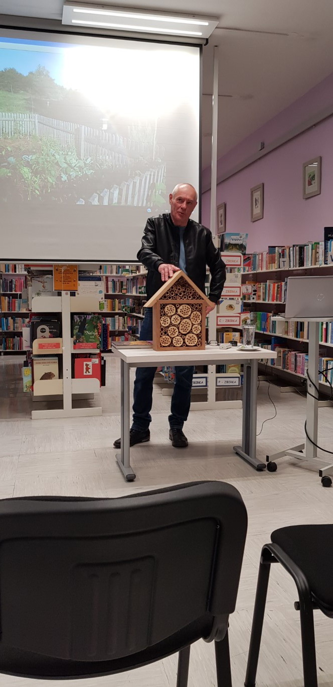 Karmen Kreže je gosta po uvodnem pozdravu povabila k besedi. Najprej je predstavil pred kratkim izdano knjigo Svet opraševalcev, ki jo je ustvaril kot soavtor. Razložil je medsebojne odnose med opraševalci in rastlinami, ki jih ti oprašujejo. Vendar opraševalke niso samo medonosne čebele, nepogrešljive so tudi druge žuželke: čmrlji, čebele samotarke, metulji in naključni obiskovalci cvetov. Poudaril je pomen hotela za žuželke, ki si ga lahko z malo spretnosti naredimo tudi sami doma.