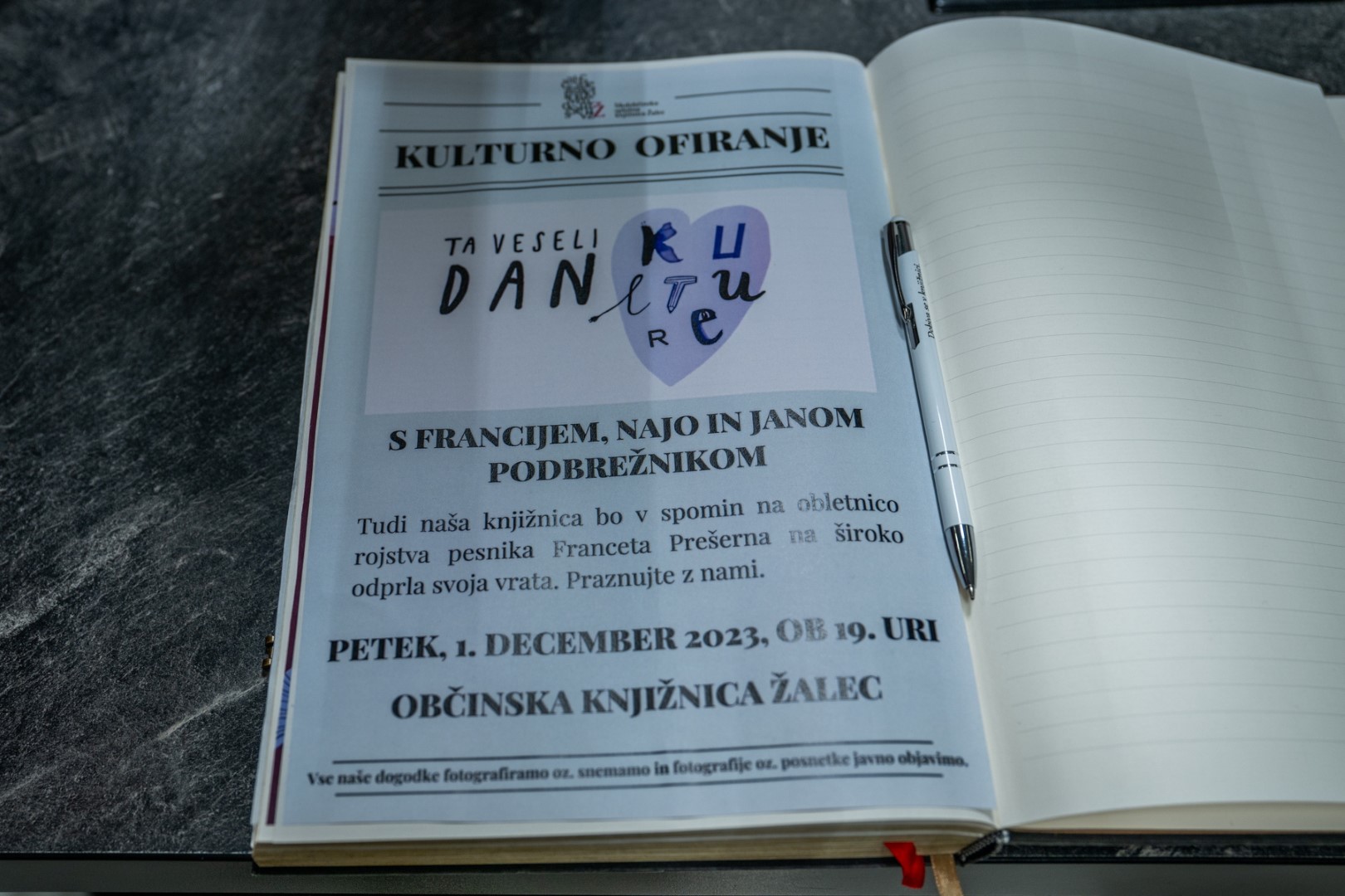 Ta veseli dan kulture s podnaslovom Kulturno ofiranje smo v Medobčinski splošni knjižnici Žalec praznovali res veselo. Ni manjkalo sproščenega klepeta, niti humorja in smeha ter petja. V goste smo namreč povabili Francija, Najo in Jana Podbrežnik, ki negujejo kulturo v najširšem pomenu besede. Z njimi se je pogovarjala direktorica knjižnice Jolanda Železnik.