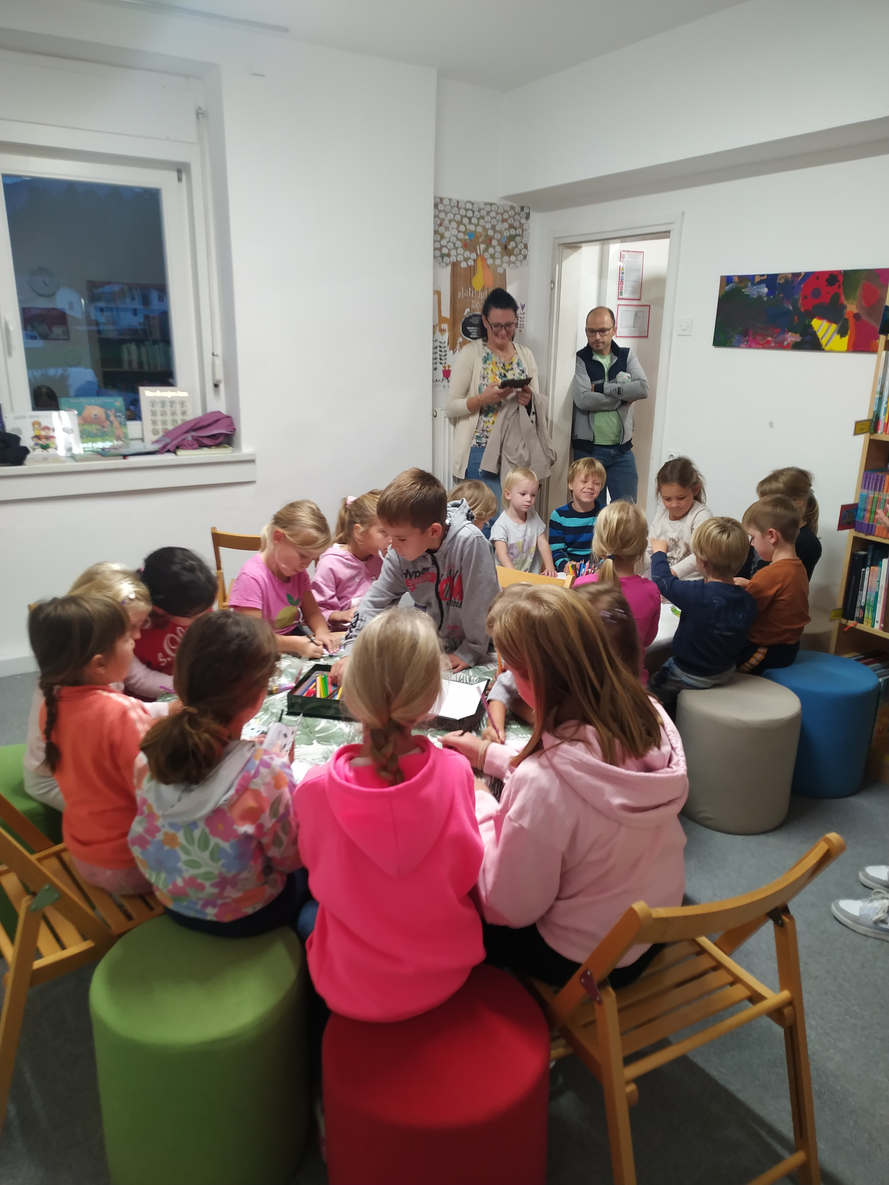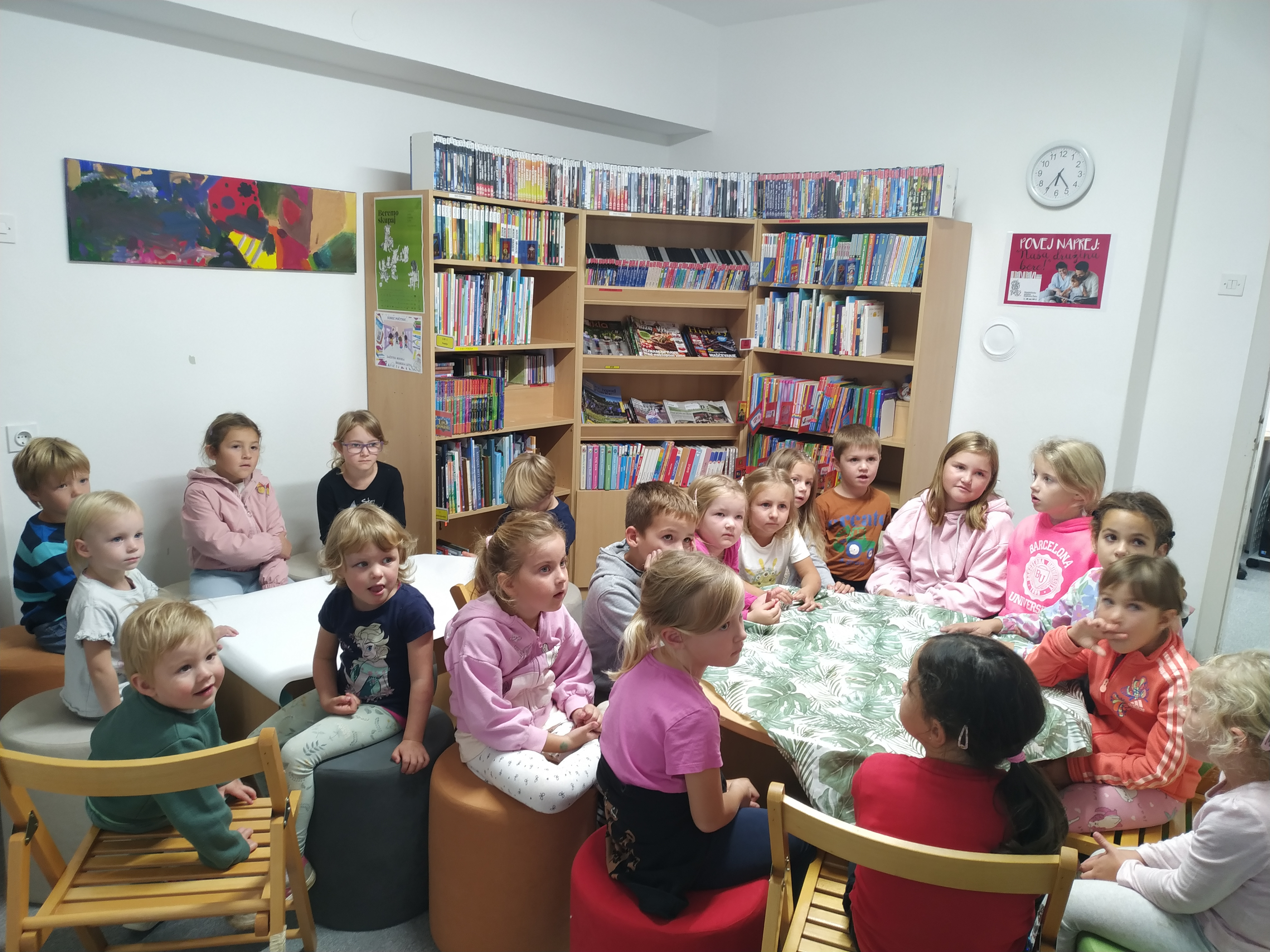 V torek, 30. septembra 2025, smo se po poletnem odmoru ponovno zbrali v Občinski knjižnici Tabor na pravljični urici. Otroci so z veseljem povedali, da uživajo v vrtcu in šoli, vendar pogrešajo počitnice in brezskrbnost, ki jo prinašajo poletni meseci.
