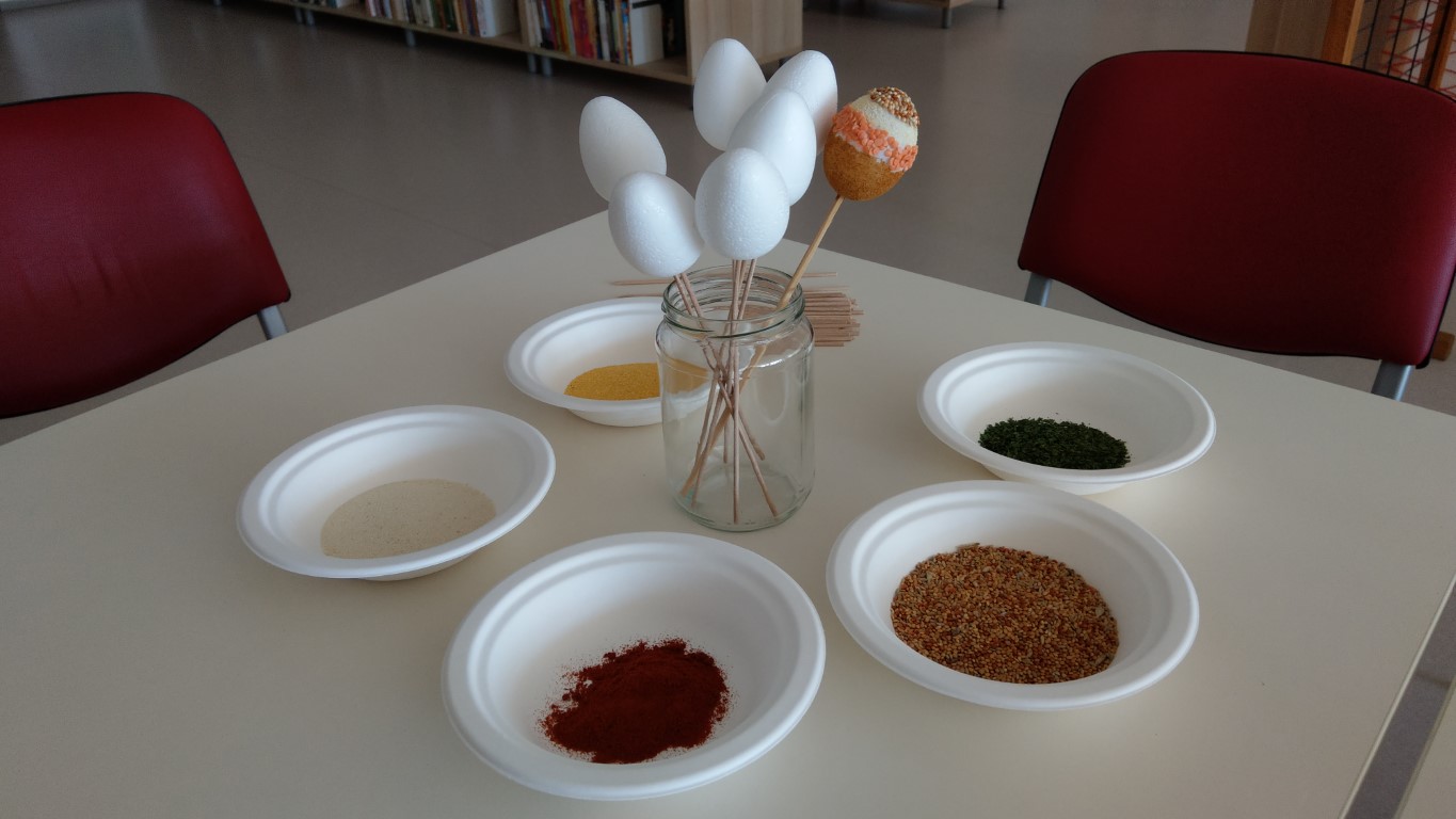 V torek, 12. aprila 2022, smo se v Občinski knjižnici Braslovče začeli pripravljati na veliko noč. Ni še zadišalo po šunki in potici, je pa priklicalo skomine in željo po pomladni dekoraciji. Skupaj s prijatelji iz Varstveno-delovnega centra Muc smo s posebno tehniko barvanja jajc izdelali nekaj zares čudovitih. Uporabili smo umetna jajca iz plastične mase, ki smo jih nataknili na kuhinjske špile. S čopičem smo nanašali različne vzorčke in jih posuli z barvnimi začimbami. Jajčke niso bile naravne, so pa zato bile barve in vonjave. Prvi letošnji pirhi so odlično uspeli in nam dali veliko novih idej za nadaljnje ustvarjanje.